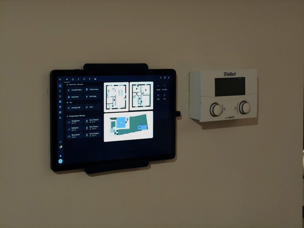 Bij deze klant plaatsten we een centraal bedieningspunt in de vorm van een strak geïntegreerde tablet. Hiermee kan hij snel muziek kiezen voor verschillende ruimtes, de airco instellen, en andere informatie zien over zijn zonnepanelen, opbrengst en energieverbruik. Ook de status van zijn wagens én alle slimme functies in huis zijn eenvoudig beschikbaar via één overzichtelijk scherm. Slim, gebruiksvriendelijk en helemaal op maat.